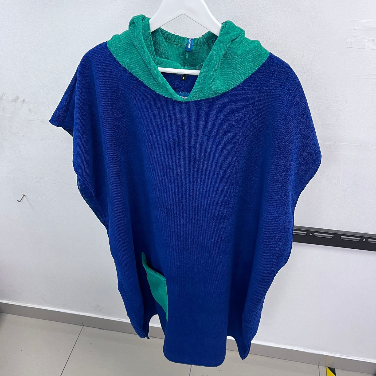 Cambiador de microfibra AZUL CAP BOL VERDE, en capucha y bolsillo frontal. Diseñado para ofrecer secado rápido y comodidad, es ideal para playa, piscina o actividades al aire libre. Salida de baño. Unisex. Ligero, práctico y fácil de transportar, combina funcionalidad y estilo para acompañarte en todas tus aventuras.