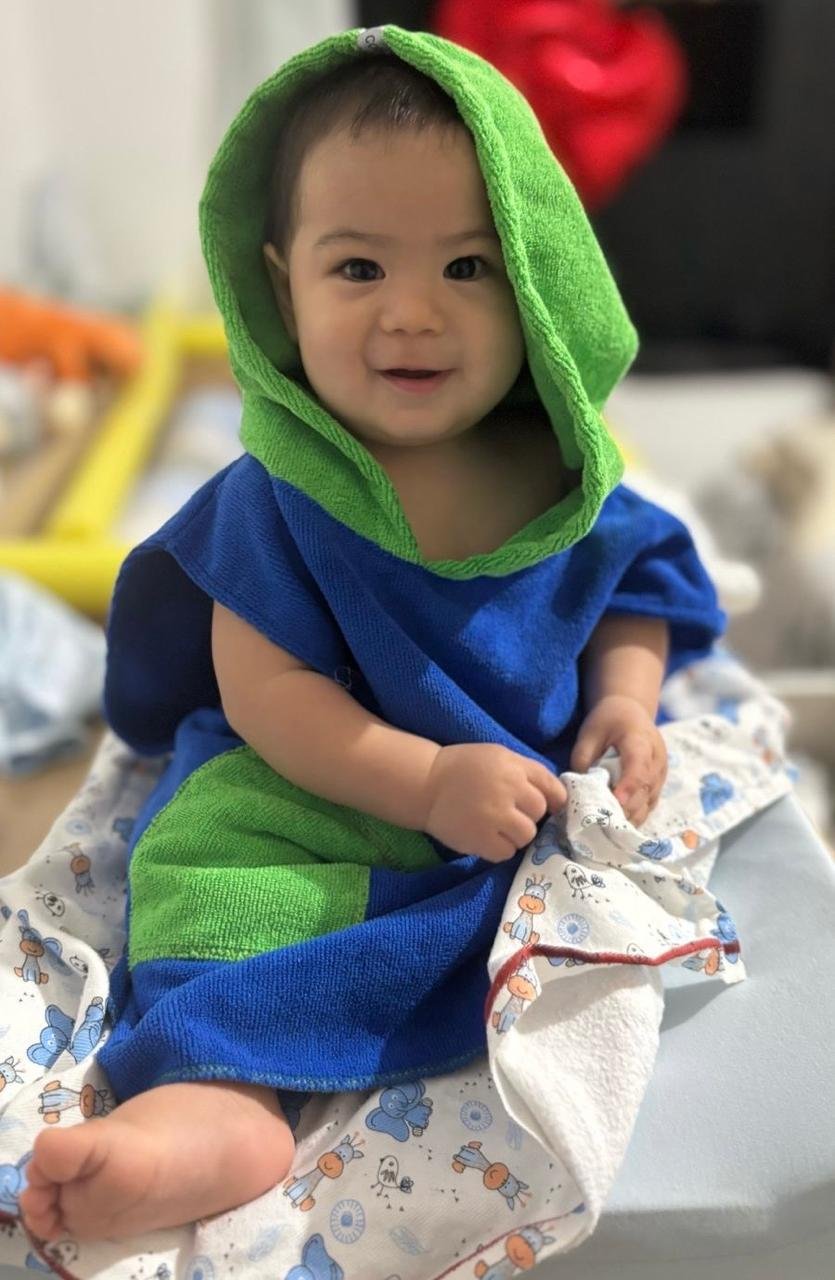 Microfibra absorbente, reemplaza la toalla, seca al contacto con el cuerpo y abrigan. COLOR AZULINO CAPUCHA VERDE, con seguridad SECAN. Como salida de baño, playa, nado en piscina, deportes en mar, academias, surf, rehab, etc. CAMBIADOR CORDANO.  Niños 1 a 2 años.  Tiene 60 cm largo desde hombros. Unisex. Marca Peruana.
