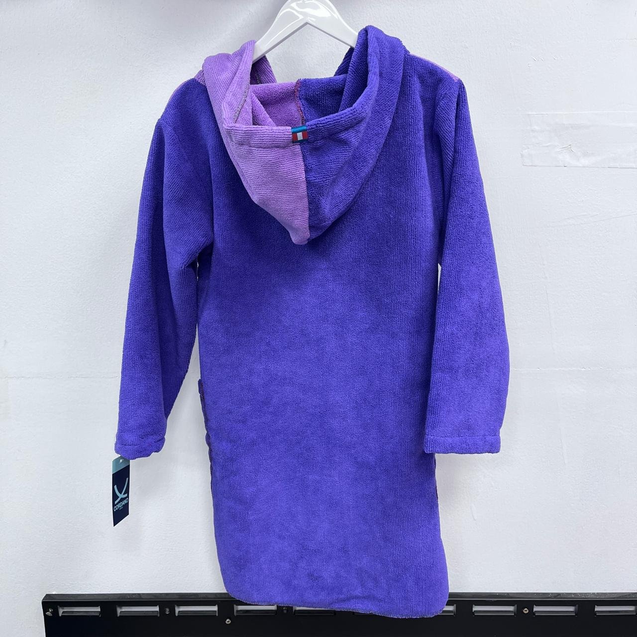 Microfibra absorbente, reemplaza la toalla, seca al contacto con el cuerpo y abrigan. COLOR MIX LILA/MORADO, con seguridad SECAN. Bata con mangas y cierre delantero. Como salida de baño, playa, nado en piscina, deportes en mar, academias, surf, rehab, etc. CAMBIADOR CORDANO. Niños 1 a 2 años. Tiene 60 cm largo desde hombros. Unisex. Marca Peruana.