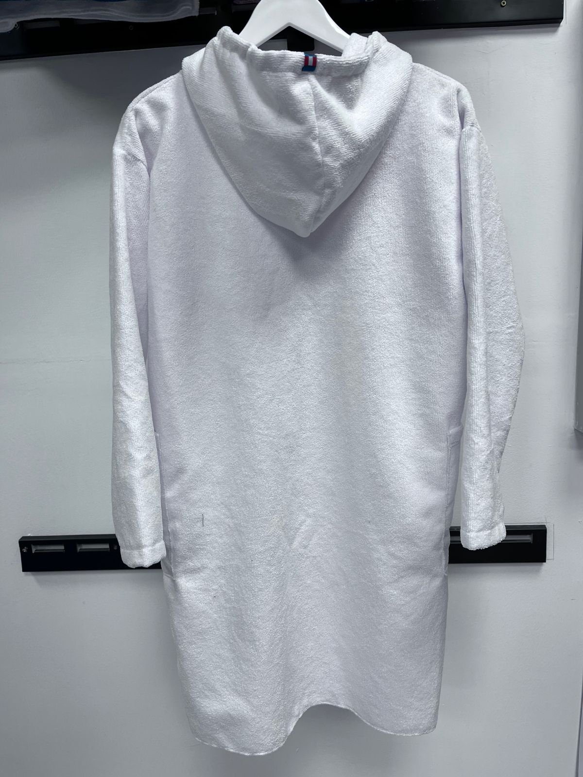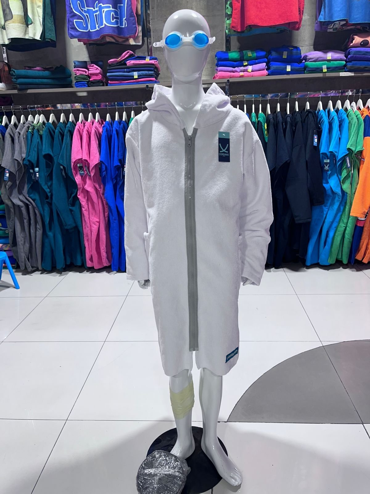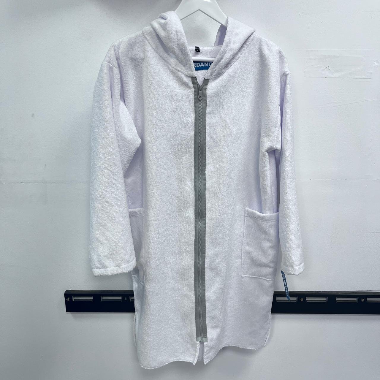 Microfibra absorbente, reemplaza la toalla, seca al contacto con el cuerpo y abrigan. Color BLANCO. Con seguridad secan. Con mangas y cierre delantero.  Como salida de baño (Bata), nado en piscina, academias, rehab, surf, deportes en el mar, etc. Cambiador CORDANO. Talla S tiene 90 cm largo desde hombros. Para niños de 9 a 11 años, que no pasen el 1.50 de estatura. De pasar, les recomendamos la siguiente talla M. Son Unisex. Marca Peruana.