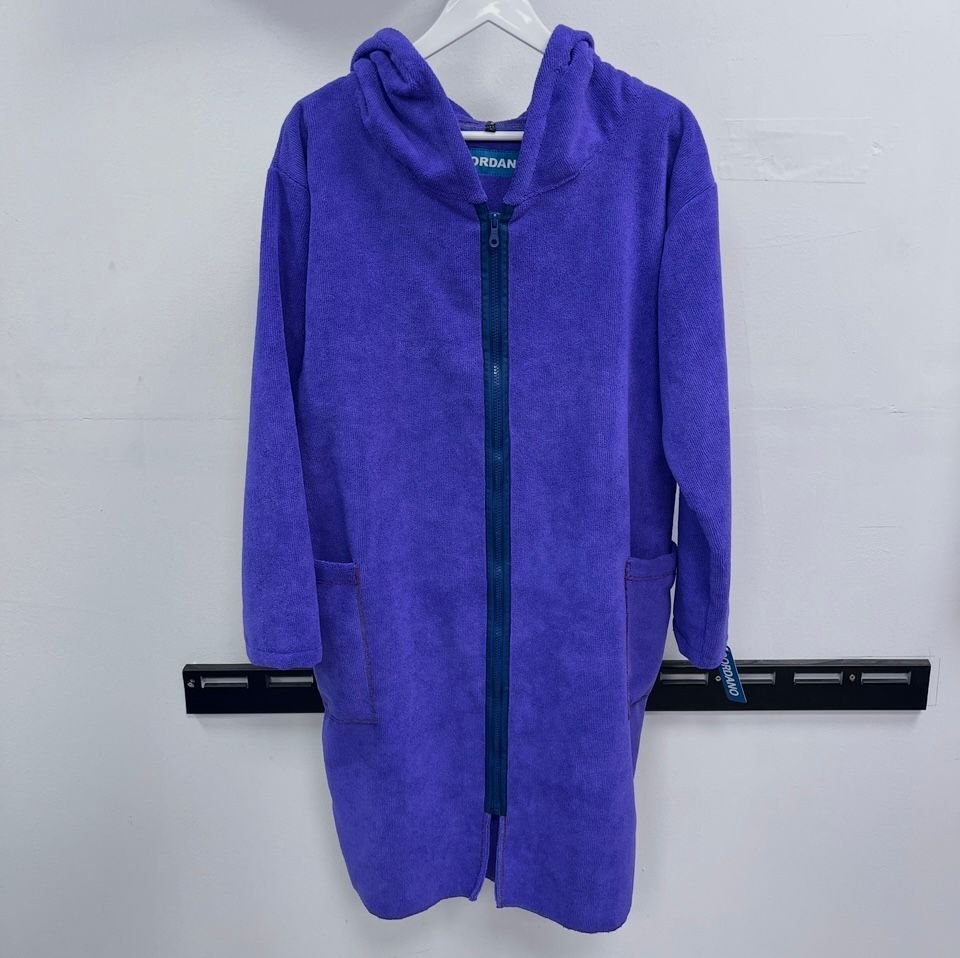 Microfibra absorbente, reemplaza la toalla, seca al contacto con el cuerpo y abrigan. Bata tipo parca color MORADO, con seguridad SECAN. Como salida de baño, playa, nado en piscina, deportes en mar, academias, surf, rehab, etc. CAMBIADOR CORDANO.  Para niños de 9 a 11 años.  Tiene 90 cm largo desde hombros. Unisex. Marca Peruana.