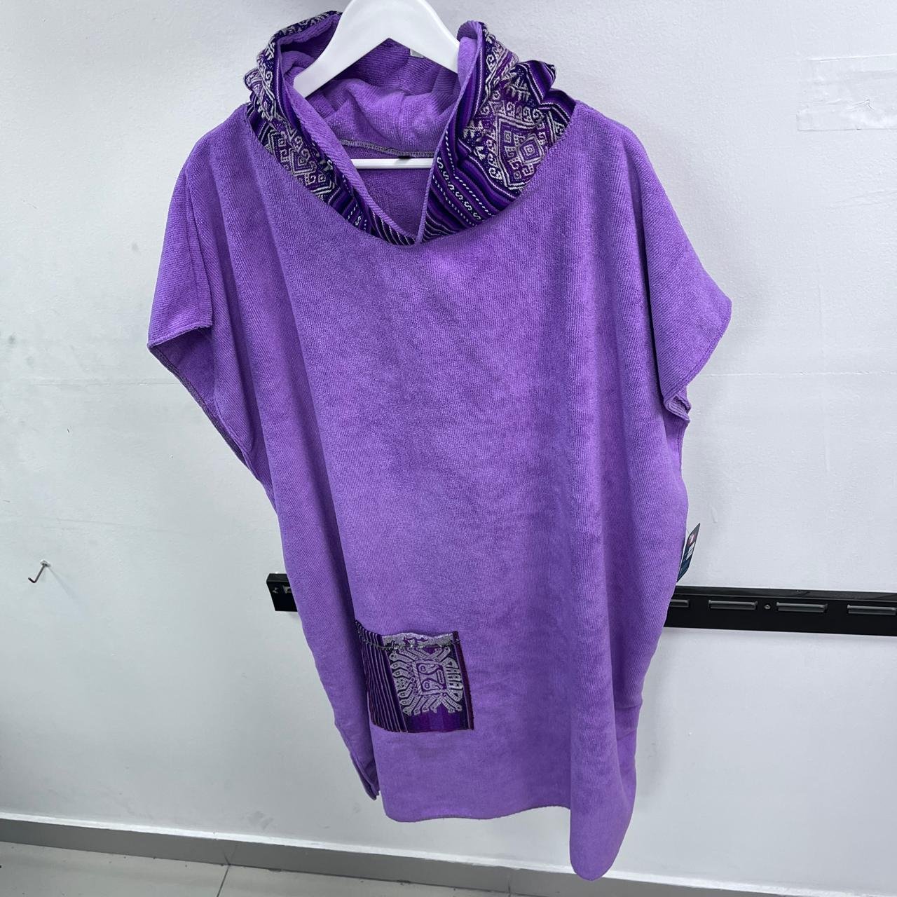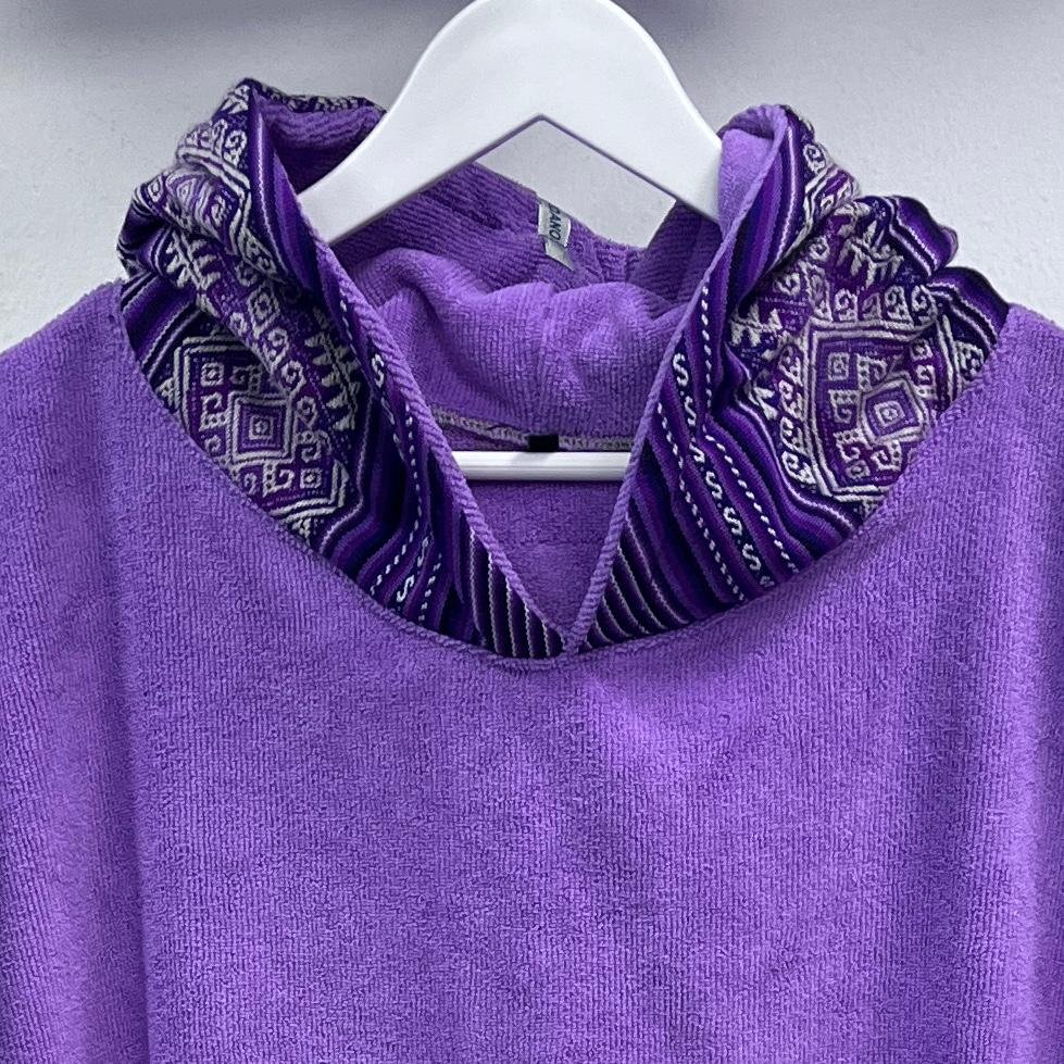 Cambiador de microfibra diseño INCAICO LILA, en capucha y bolsillo frontal. Diseñado para ofrecer secado rápido y comodidad, es ideal para playa, piscina o actividades al aire libre. Salida de baño. Unisex. Ligero, práctico y fácil de transportar, combina funcionalidad y estilo para acompañarte en todas tus aventuras.
